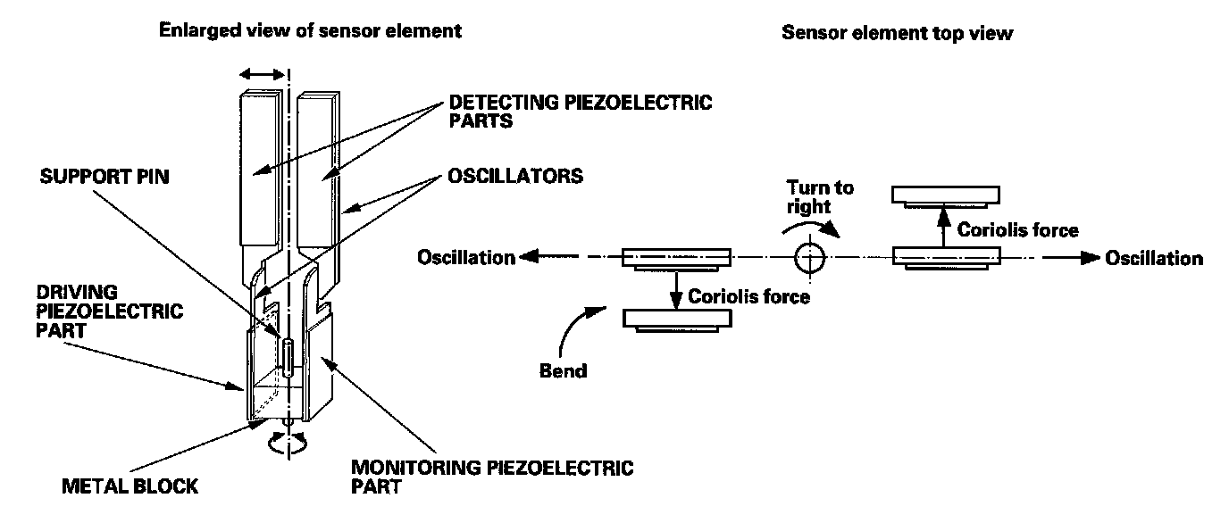 The piezoelectric parts have electric/mechanical transfer characteristics. They bend vertically when voltage is applied to both sides of the parts, and voltage is generated between both sides of the piezoelectric parts when they are bent by an external force. The oscillation gyro functions by utilizing this characteristic of the piezoelectric parts and Coriolis force. (Coriolis force deflects moving objects as a result of the earth's rotation.) In the oscillation gyro, this force moves the sensor element when angular velocity is applied.