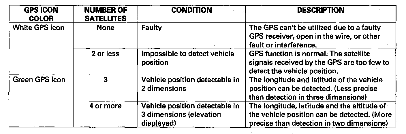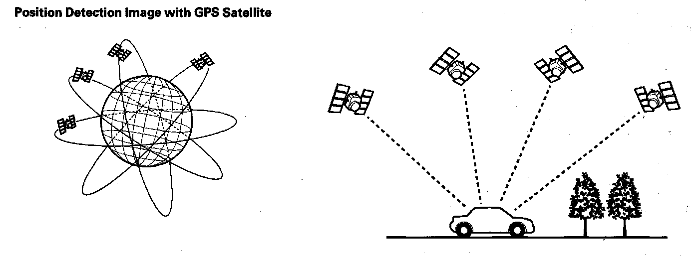 The global positioning system (GPS) enables the navigation system to determine the current position of the vehicle by using the signals transmitted from the satellites in orbit around the earth. The satellites transmit the satellite identification signal, orbit information, transmission time signal, and other information. When the GPS receiver receives a signal from four or more satellites simultaneously, it calculates the current position of the vehicle based on the distance to each satellite and the satellite's positions in its respective orbit.