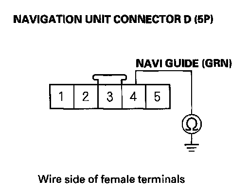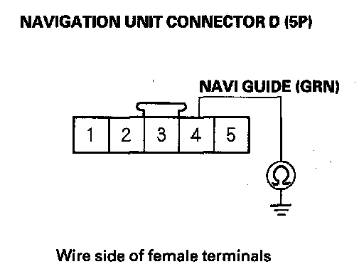 6. Check for continuity between body ground and navigation unit connector D (5P) terminals No. 4.