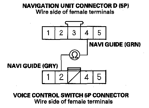7. Check for continuity between navigation unit connector D (5P) terminal No. 4 and voice control switch 5P connector terminal No. 2.