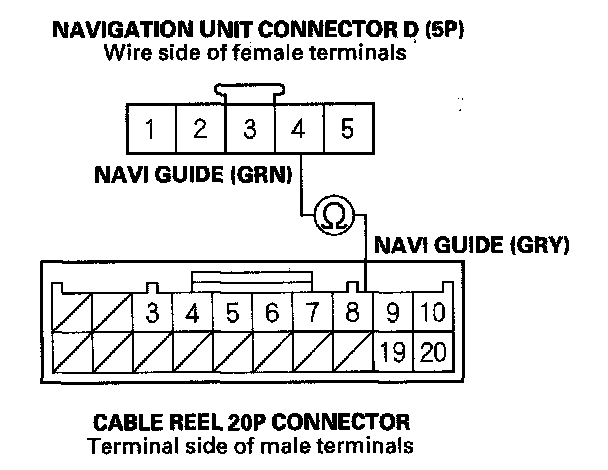 12. Check for continuity between navigation unit connector D (5P) terminal No. 4 and cable reel 20P connector terminal No. 8.