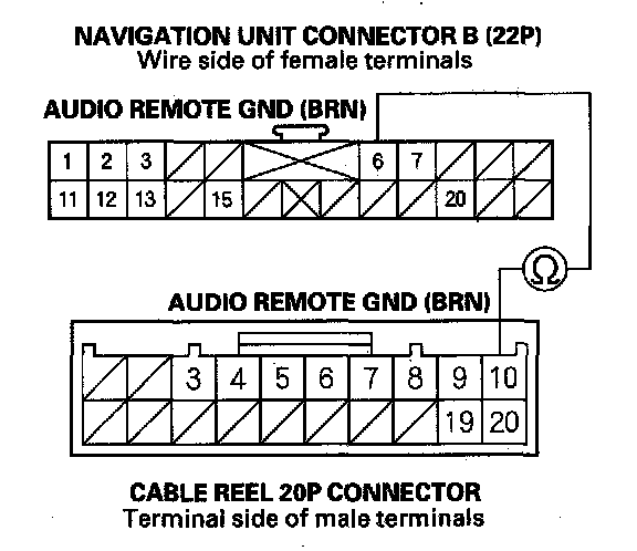 14. Check for continuity between navigation unit connector B (22P) terminal No. 6 and cable reel 20P connector terminal No. 10.