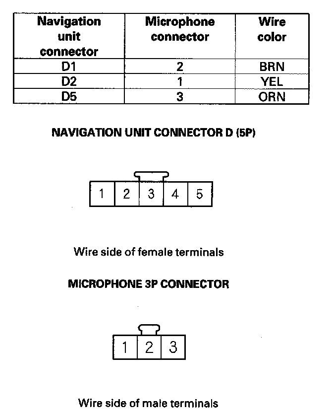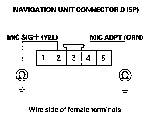 21. Check for continuity between navigation unit connector D (5P) and microphone 3P connector according to the table.