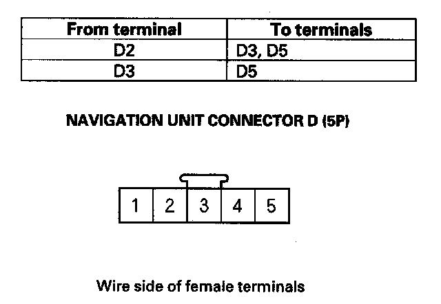 20. Check for continuity between navigation unit connector D (5P) according to the table.