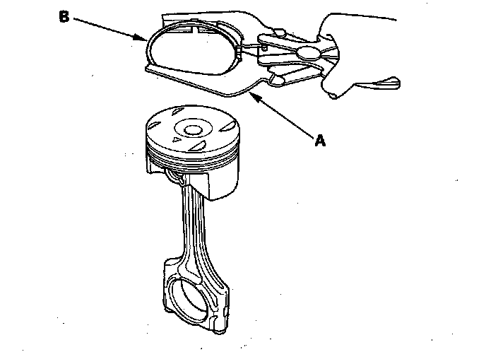 2. Using a ring expander (A), remove the old piston rings (B).