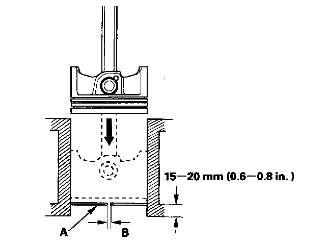 4. Using a piston, push a new ring (A) into the cylinder bore 15 - 20 mm (0.6 - 0.8 in.) from the bottom.