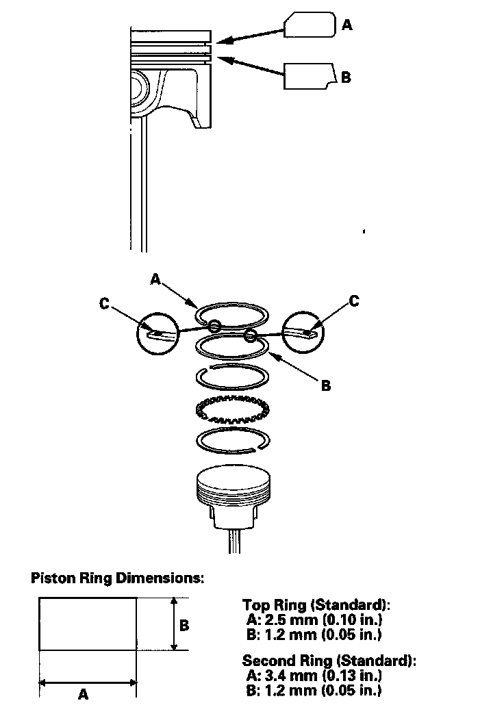 5. Measure the piston ring end-gap (B) with a feeler gauge: