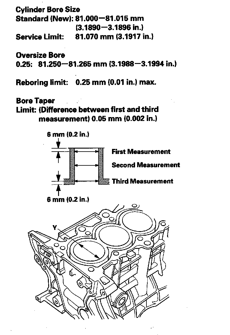 4. Measure the wear and taper Y at three levels inside each cylinder as shown. If the measurements in any cylinder are beyond the Oversize Bore Service Limit, replace the engine block. If the engine block is being rebored, refer to step 7 after reboring.