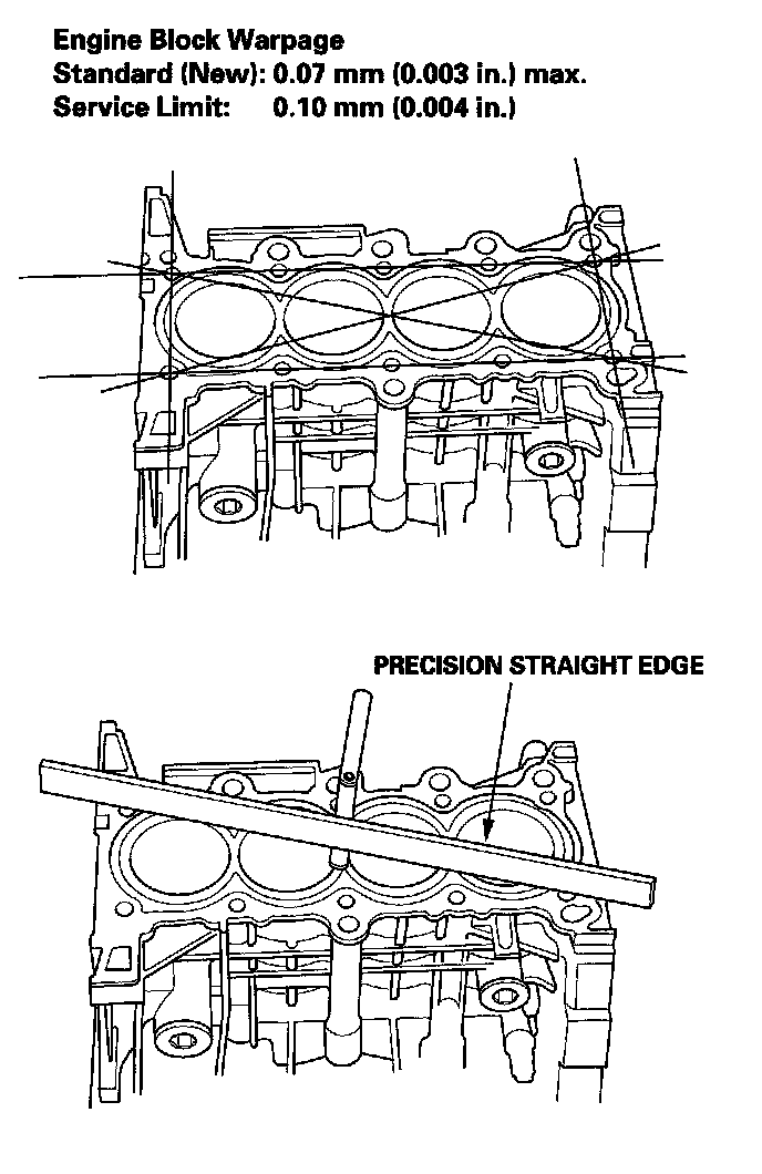 6. Check the top of the engine block for warpage. Measure along the edges, and across the center as shown.