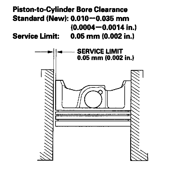 7. Calculate the difference between the cylinder bore diameter and the piston diameter. If the clearance is near, or exceeds the service limit, inspect the piston and engine block for excessive wear.