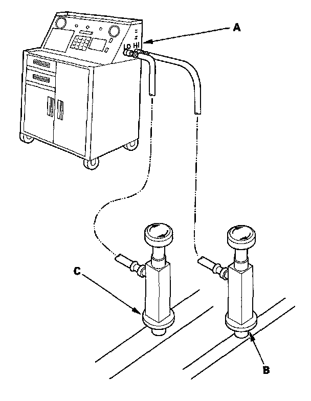 1. Connect an R-134a refrigerant recovery/recycling/charging station (A) to the high-pressure service port (B) and the low-pressure service port (C), as shown, following the equipment manufacturer's instructions.