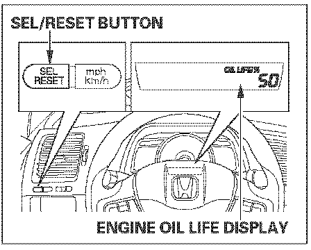 To see the current engine oil life, turn the ignition switch to the ON (II) position, then push and release the SEL/RESET button repeatedly until the engine oil life indicator appears.