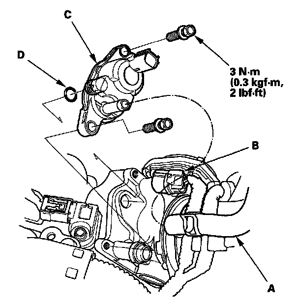 4. Install the parts in the reverse order of removal with a new O-ring (D).