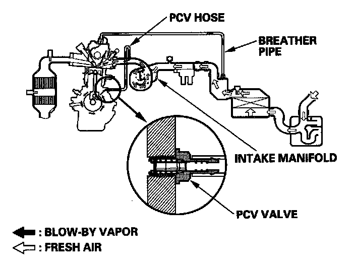 The PCV valve prevents blow-by gasses from escaping into the atmosphere by venting them into the intake manifold.