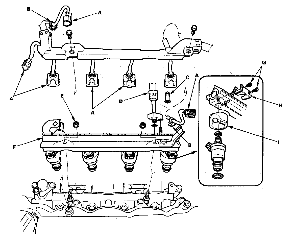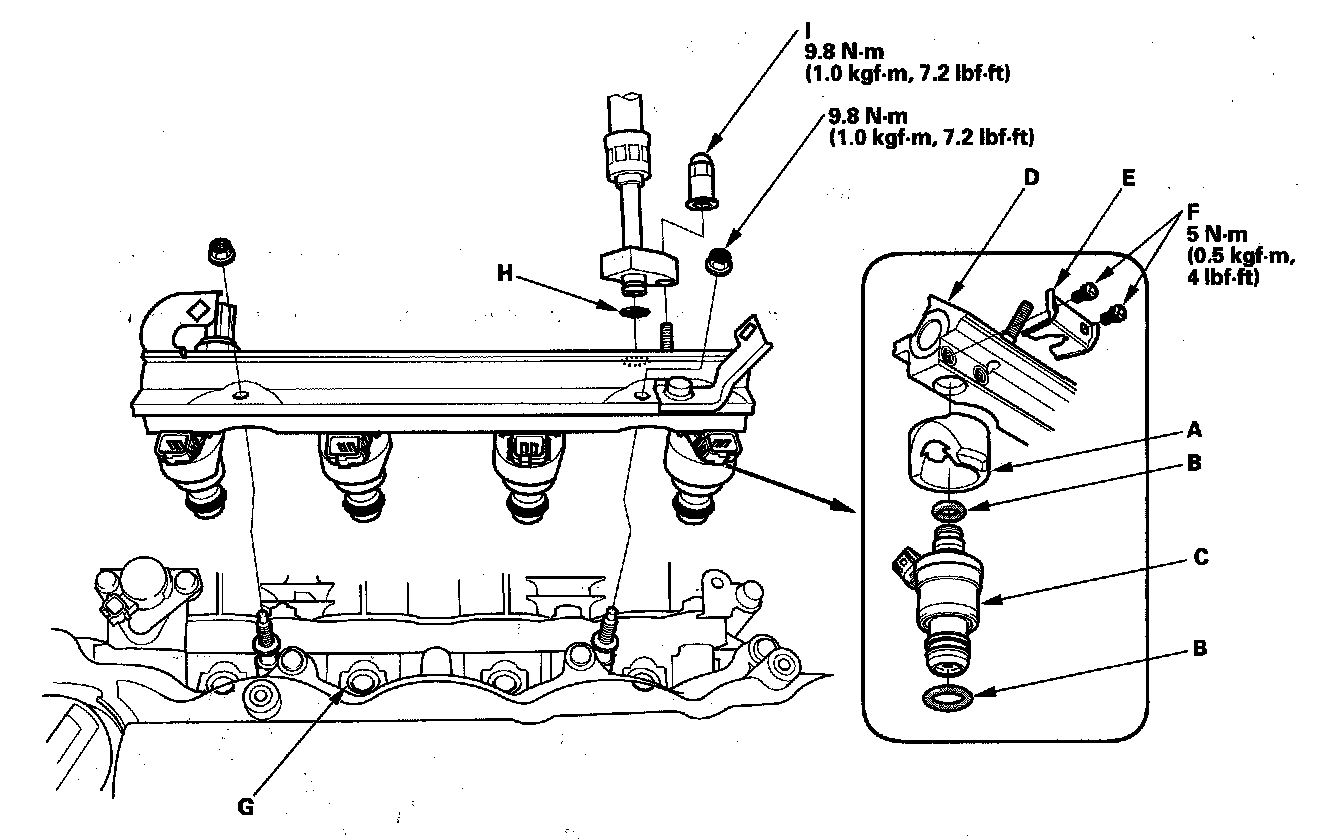 12. Install the fuel rail and the injector into the cylinder head (G).
