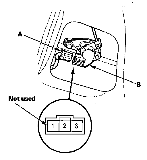 2. Disconnect the 3P connector (A) from the trunk key cylinder switch (B).