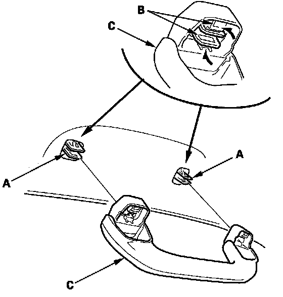 6. Install the clips (A) to the grab handle (B), then install the stoppers (C) fully into the clips.