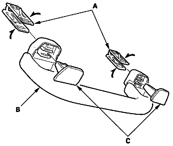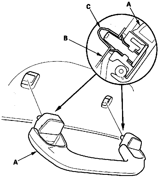 7. Position the grab handle (A) on the bracket (B), and push on the grab handle until the clips (C) snap into place securely.