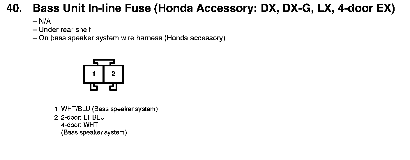 40. Bass Unit In-line Fuse (Honda Accessory: DX, DX-G, LX, 4-door EX):