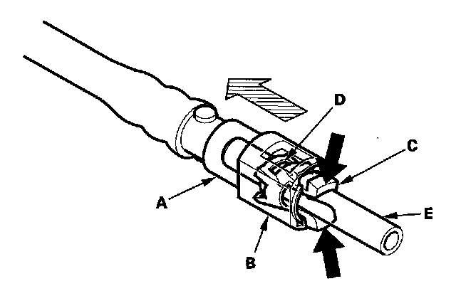 11. Disconnect the quick-connect fitting (A): Hold the connector (B) with one hand, and squeeze the retainer tabs (C) with the other hand to release them from the locking tabs (D). Pull the connector off.