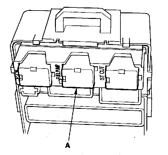 2. Remove the under-dash fuse/relay box, then remove PGM-FI main relay 2 (FUEL PUMP) (A) from the under-dash fuse/relay box.
