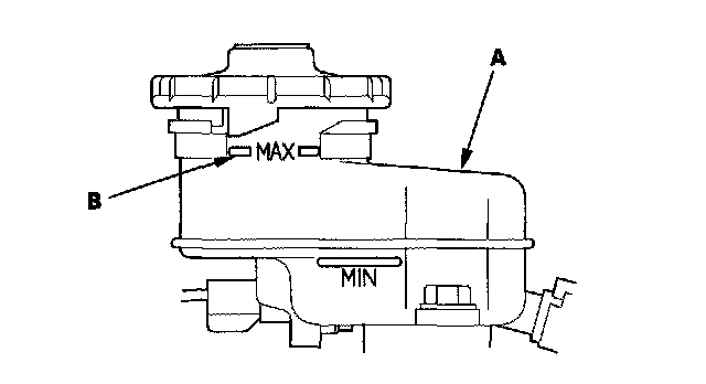 1. Make sure the brake fluid level in the reservoir (A) is at the MAX (upper) level line (B).