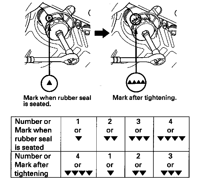 ^ Spin the filter on until its seal lightly seats against the oil pan, and note which number or mark is at the bottom.