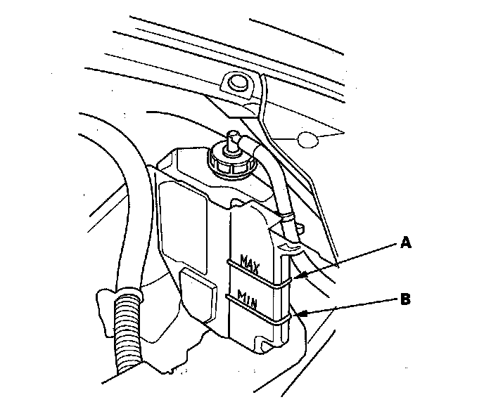 Coolant Check1. Look at the coolant level in the coolant reservoir. Make sure it is between the MAX mark (A) and MIN mark (B).