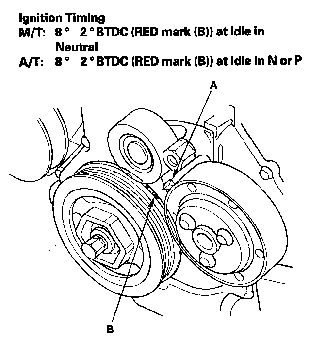 9. Aim the light toward the pointer (A) on the cam chain case. Check the ignition timing under a no load condition (headlights, blower fan, rear window defogger, and air conditioner are turned off).