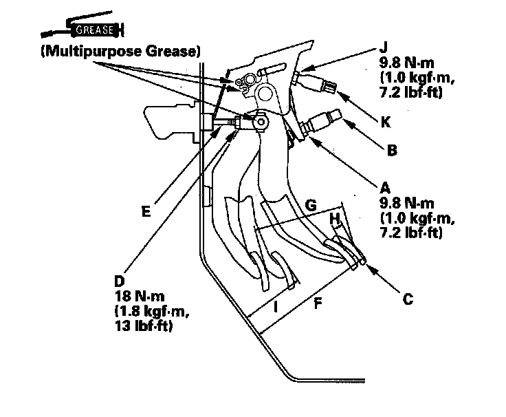 Loosen the clutch pushrod locknut (D), and turn the pushrod (E) in or out to get the specified height (F), stroke (G), free play (H), and disengagement height (I) at the clutch pedal.