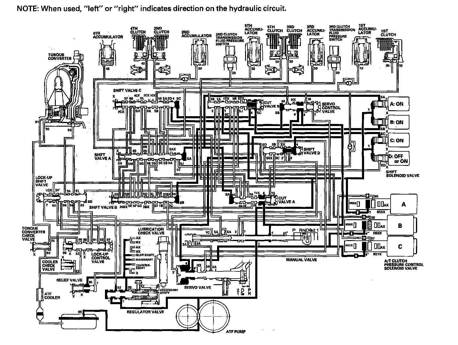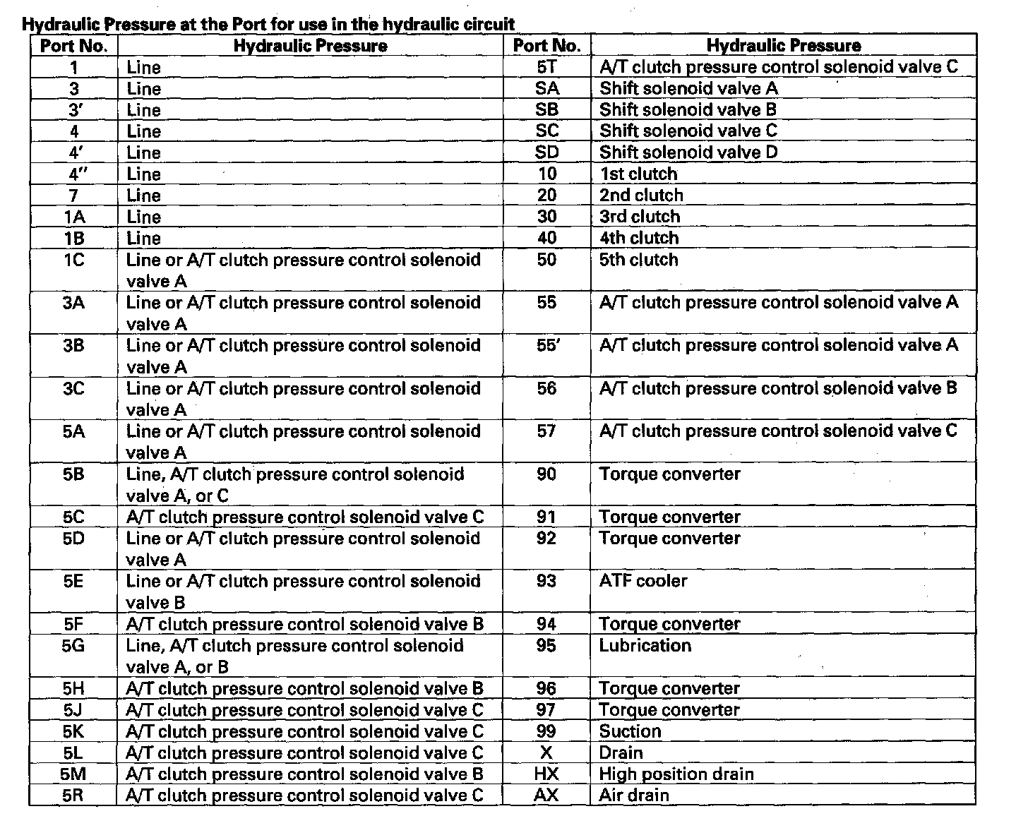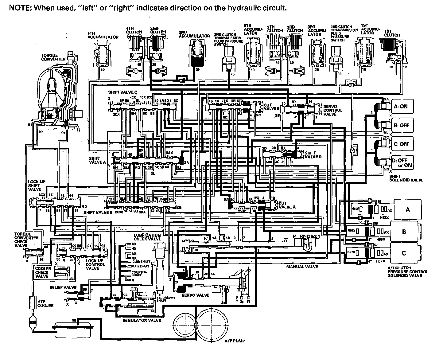 The PCM turns the shift solenoid valves ON and OFF. The shift solenoid valve controls line pressure from the ATF pump via the manual valve when the shift solenoid valve is OFF. When the shift solenoid valve is turned ON by the PCM, line pressure changes to shift solenoid valve pressure at the shift solenoid valve, then the shift solenoid valve pressure flows to the shift valve. Applying shift solenoid pressure to the shift valve moves the position of the shift valve, and switches the port of the hydraulic circuit. The PCM also controls A/T clutch pressure control solenoid valves A, B, and C. The A/T clutch pressure control solenoid valves regulate hydraulic pressure, and apply the pressure to the clutches to engage smoothly, The clutches receive optimum clutch pressure which is regulated by the A/T clutch pressure control solenoid valves for comfortable driving and shifting under all conditions.