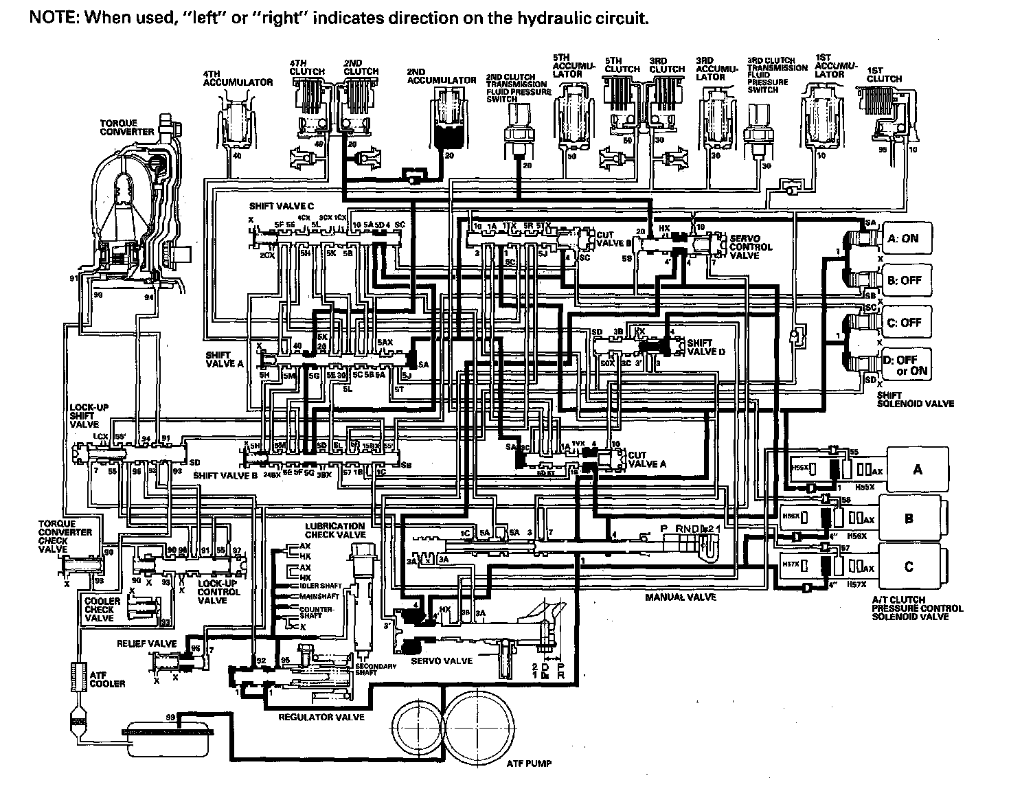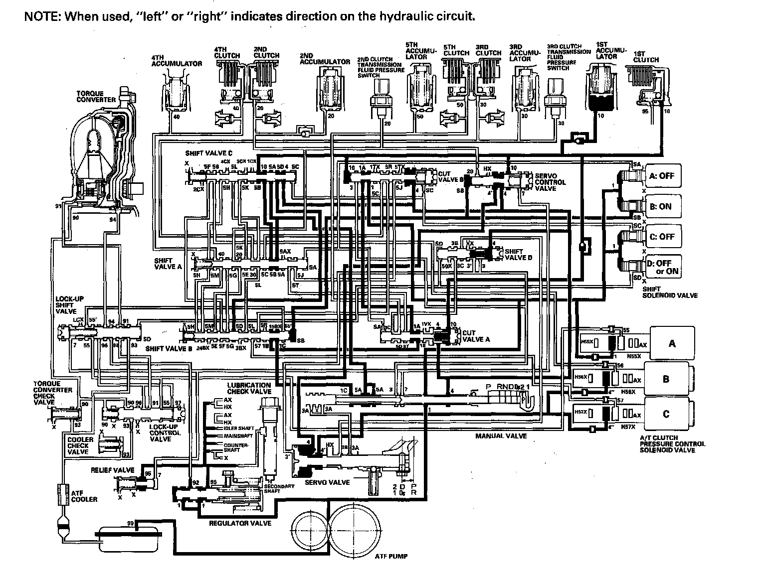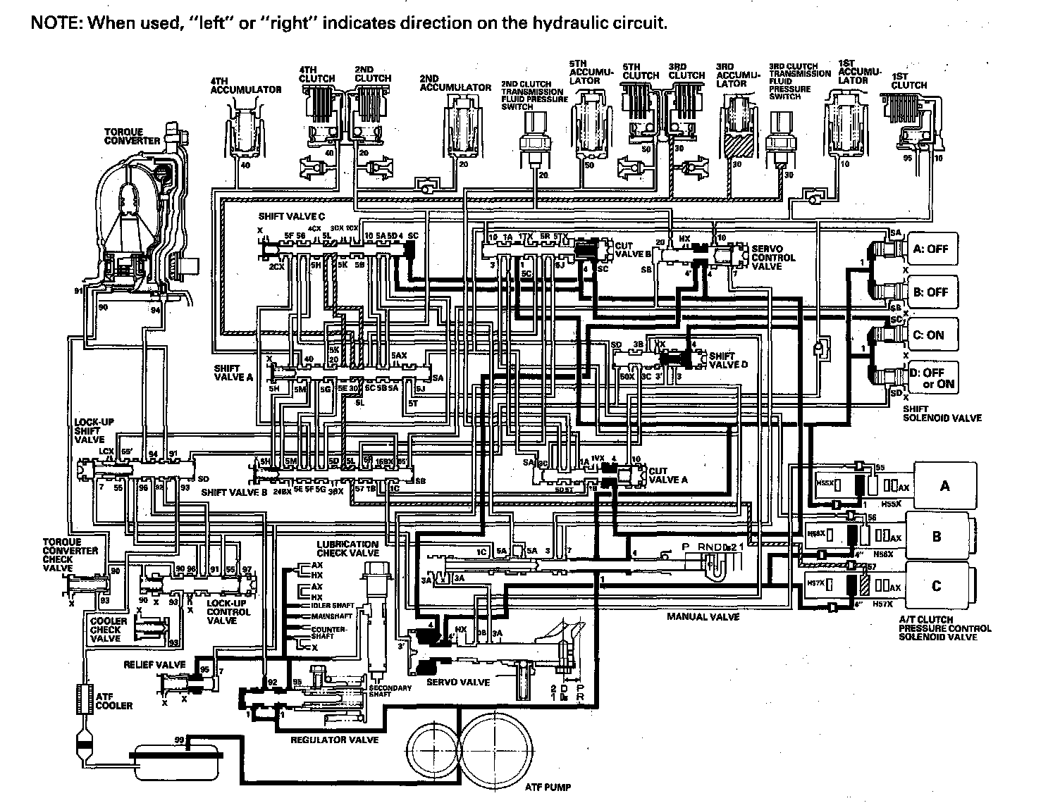 The PCM turns the shift solenoid valves ON and OFF. The shift solenoid valve controls line pressure from the ATF pump via the manual valve when the shift solenoid valve is OFF. When the shift solenoid valve is turned ON by the PCM, line pressure changes to shift solenoid valve pressure at the shift solenoid valve, then the shift solenoid valve pressure flows to the shift valve. Applying shift solenoid pressure to the shift valve moves the position of the shift valve, and switches the port of the hydraulic circuit. The PCM also controls A/T clutch pressure control solenoid valves A, B, and C. The A/T clutch pressure control solenoid valves regulate hydraulic pressure, and apply the pressure to the clutches to engage smoothly, The clutches receive optimum clutch pressure which is regulated by the A/T clutch pressure control solenoid valves for comfortable driving and shifting under all conditions.