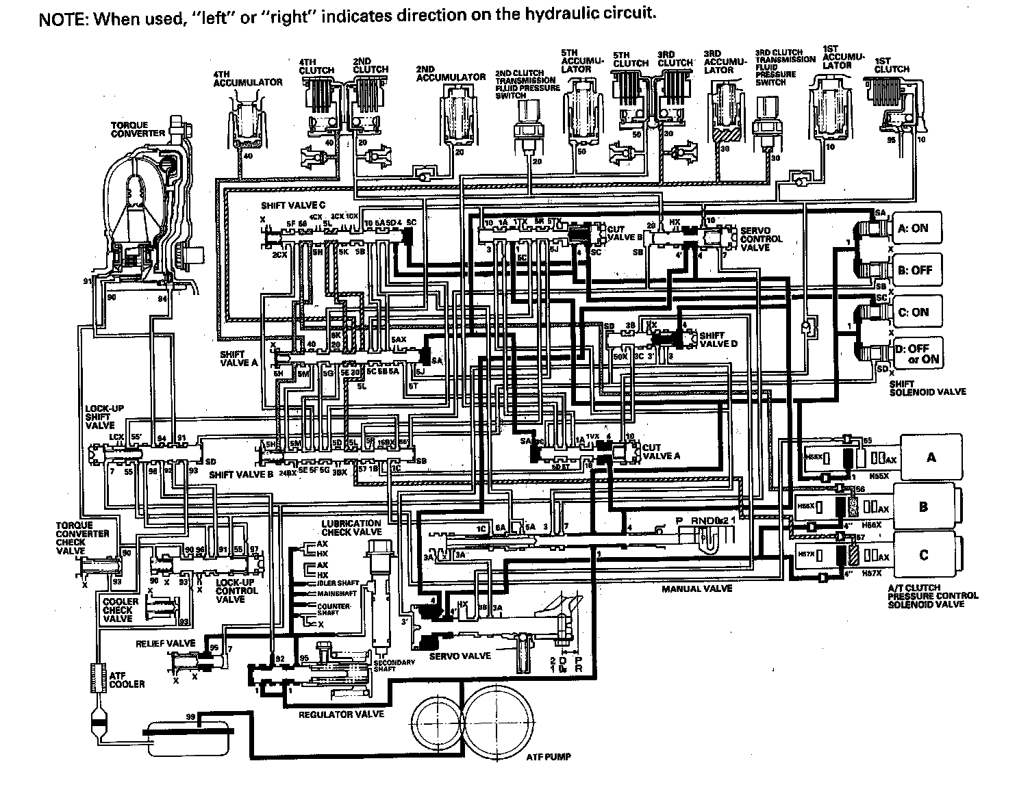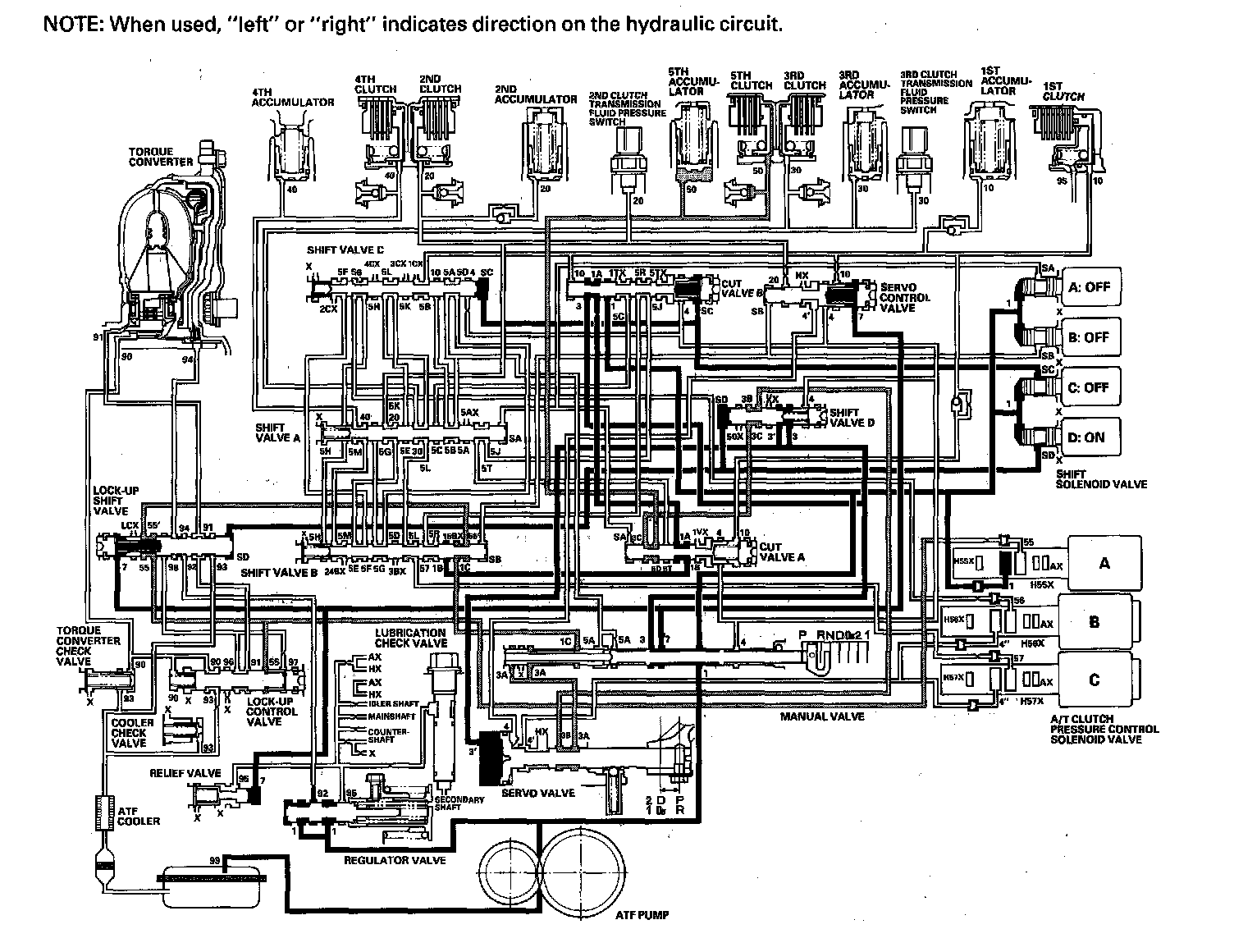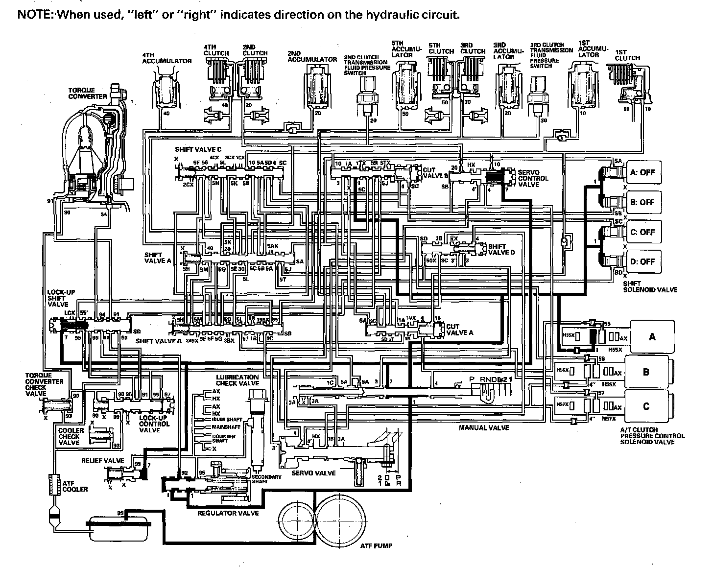 ^ Line pressure (1) from the manual valve flows to cut valve B, cut valve A, shift valve B, and becomes line pressure (5A) at the manual valve. Line pressure (5A) passes through shift valve A, flows to shift valve C, and becomes 1st clutch pressure (10). 1st clutch pressure (10) is applied to the 1st clutch, and the 1st clutch is engaged.