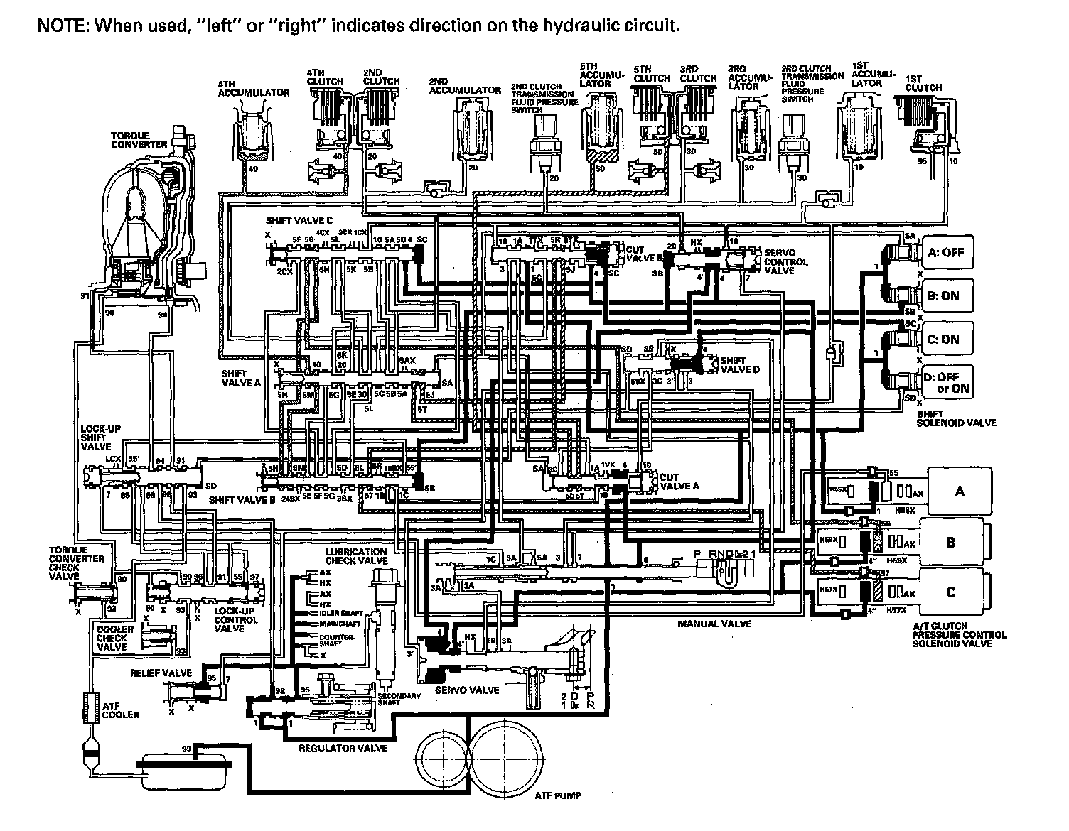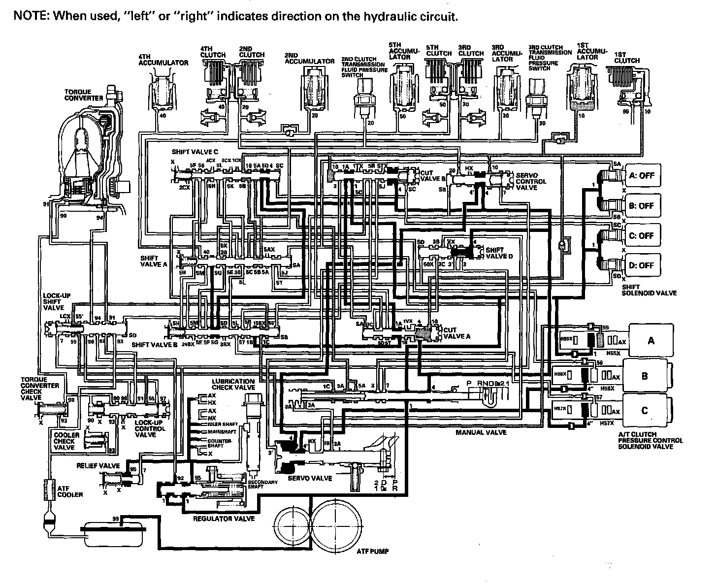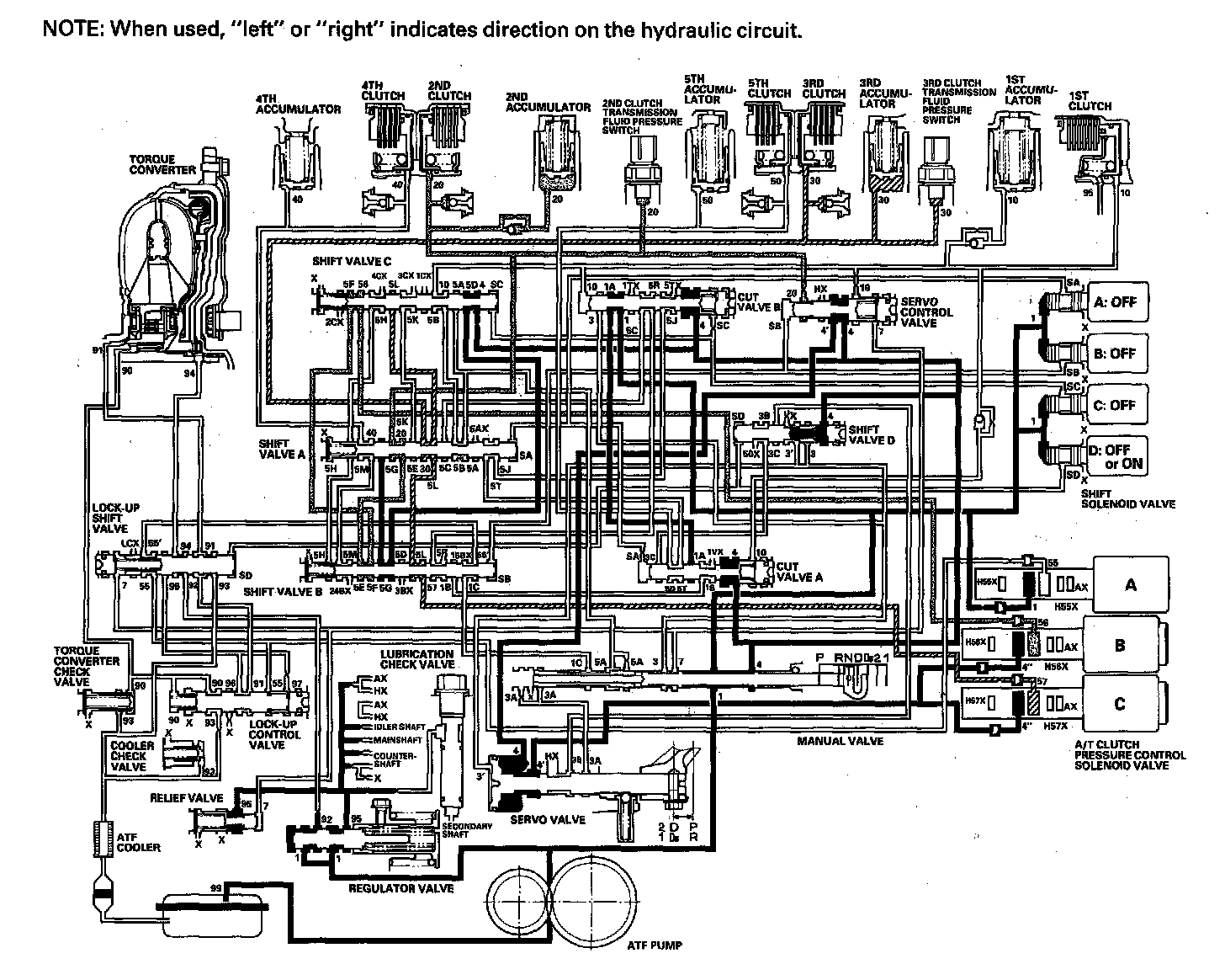 ^ Line pressure (1) from the manual valve flows to cut valve B, cut valve A, shift valve B, and becomes line pressure (5A) at the manual valve. Line pressure (5A) passes through shift valve A, flows to shift valve C, and becomes 1st clutch pressure (10). 1st clutch pressure (10) is applied to the 1st clutch, and the 1st clutch is engaged.