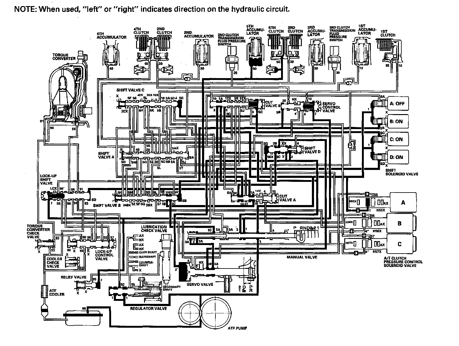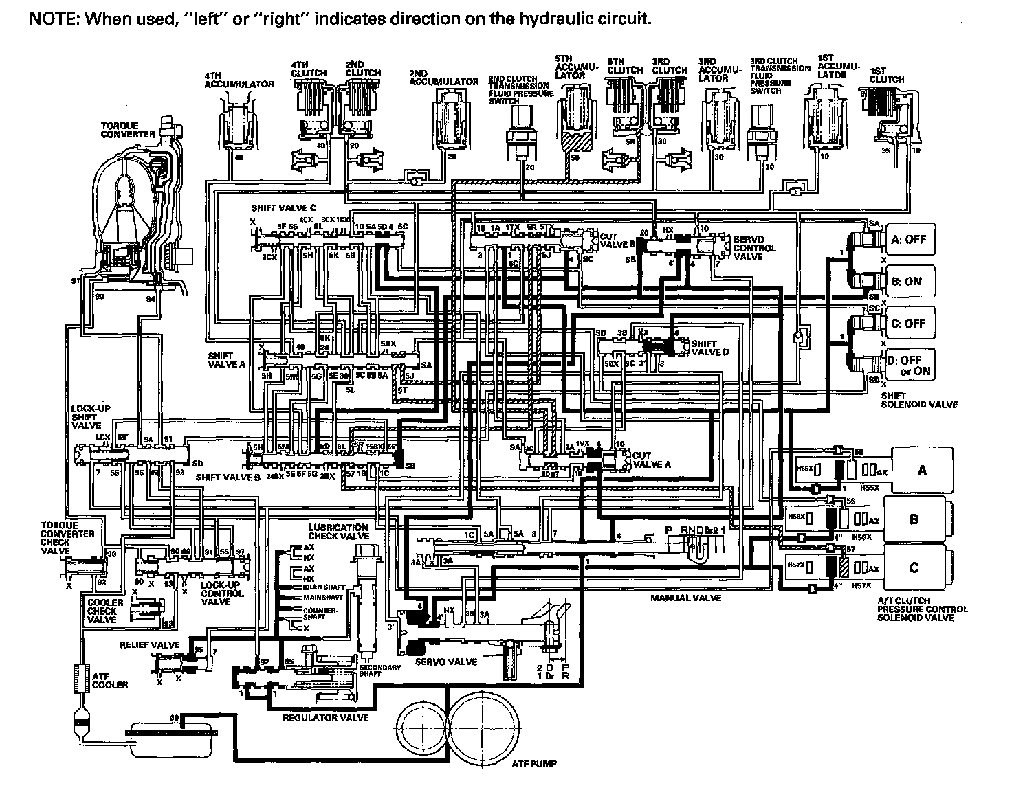 ^ Line pressure travels up and through shift valve C (5D), through shift valve B (5G), and then up to shift valve A (20) to become 2nd clutch pressure. The 2nd clutch is engages by the 2nd clutch pressure.