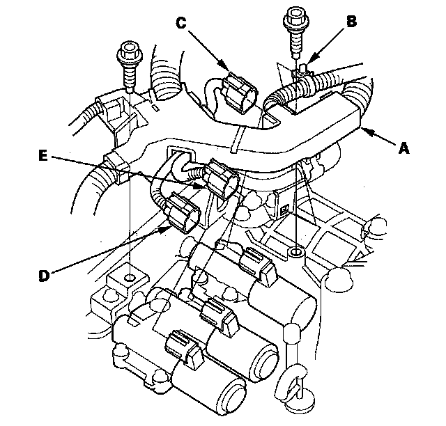 14. Disconnect the A/T clutch pressure control solenoid valve A connector (C), the A/T clutch pressure control solenoid valve B connector (D), and the A/T clutch pressure control solenoid valve C connector (E).