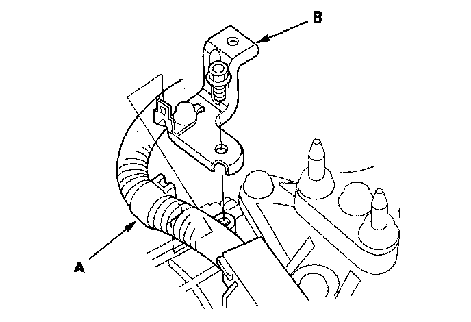 19. Disconnect the ATF warmer hoses (A) from the ATF lines (B). Turn the end of the ATF warmer hoses up to prevent ATF from flowing out, then plug the hoses and lines.