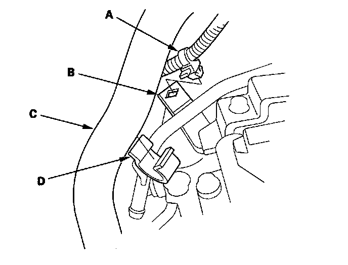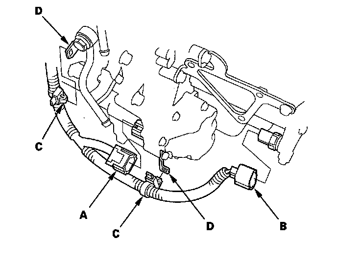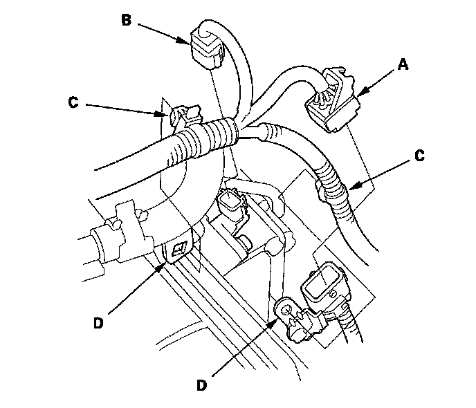 21. Disconnect the shift solenoid harness connector (A) and the 3rd clutch transmission fluid pressure switch connector (B), and remove the harness clamps (C) from the clamp brackets (D).