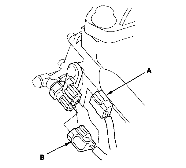 18. Disconnect the input shaft (mainshaft) speed sensor connector (A) and the 2nd clutch transmission fluid pressure switch connector (B).