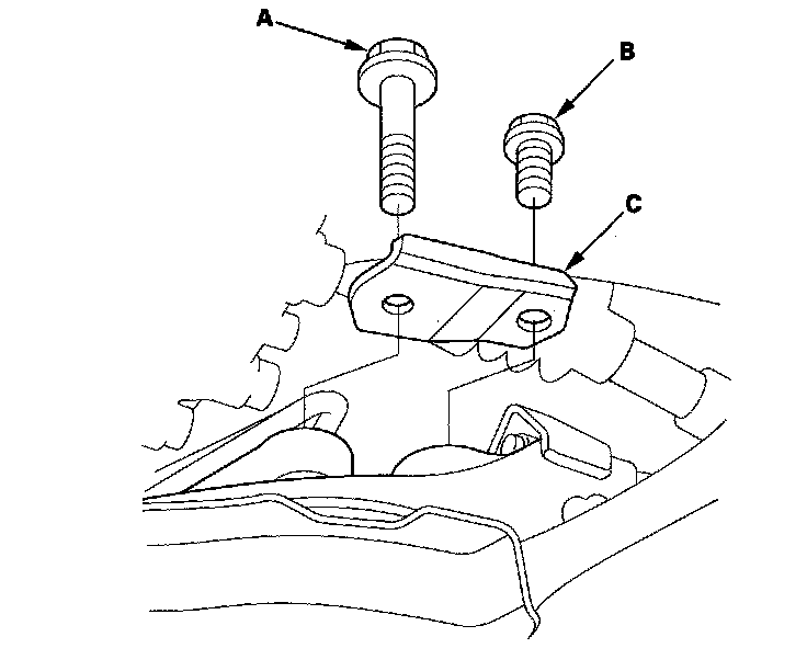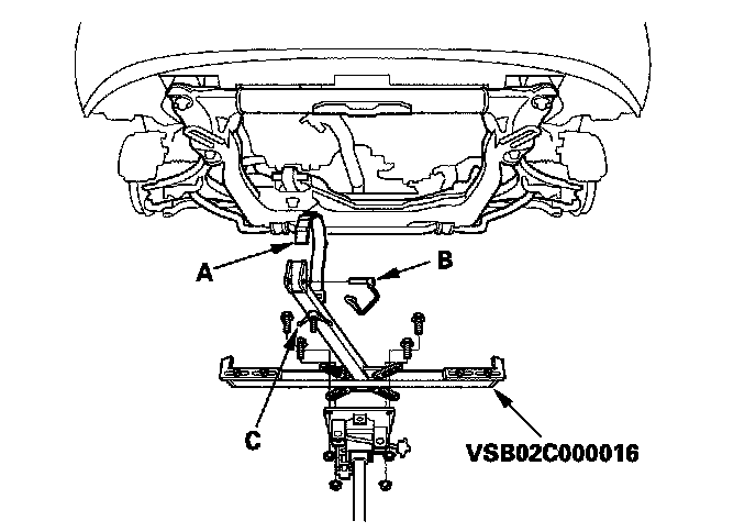 32. Remove the front steering gearbox mounting bolt (A), the stiffener mounting bolt (B), and the stiffener (C).