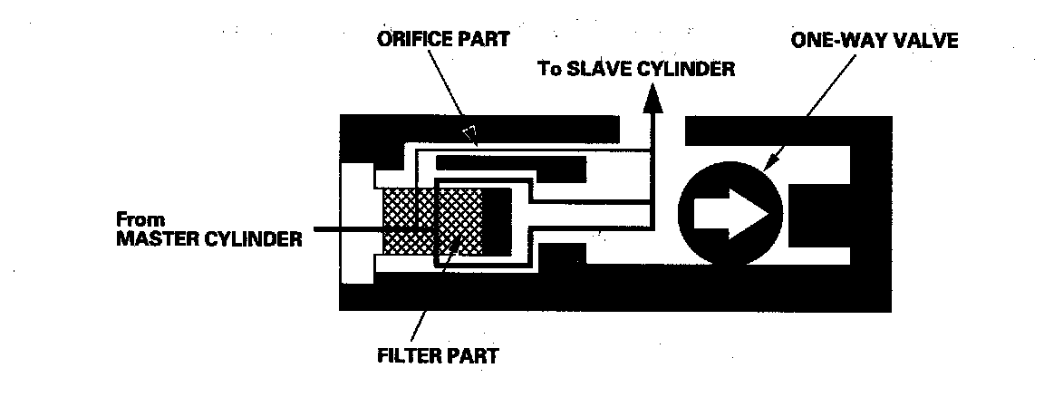 When the clutch pedal is pressed, the fluid pressure from the master cylinder moves the one-way valve in the direction shown in the illustration. The fluid flows through two passages: the orifice part and the filter part. It then flows out to the slave cylinder to release the pressure plate and clutch disc joint.