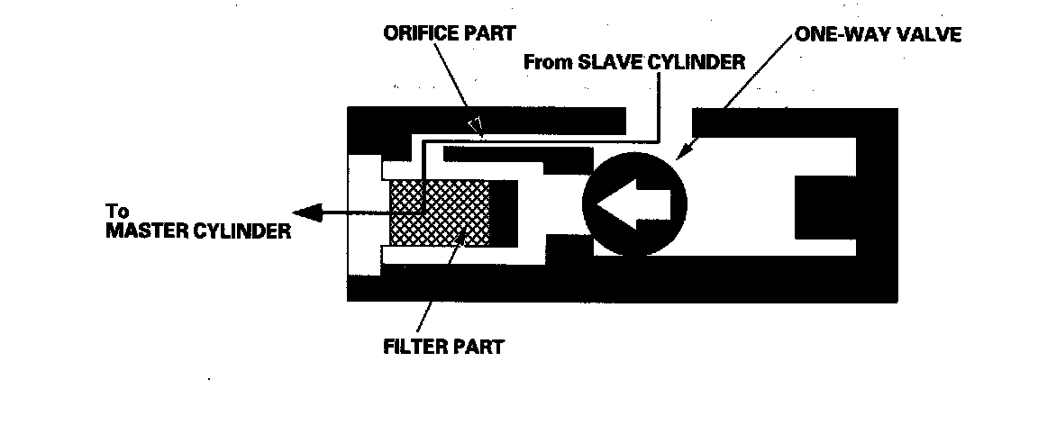 When the clutch pedal is released, the fluid pressure from the slave cylinder moves the one-way valve in the direction shown in the illustration. The one-way valve blocks the filter-part passage and delays the clutch release speed by returning the fluid to the master cylinder through only the orifice-part passage.