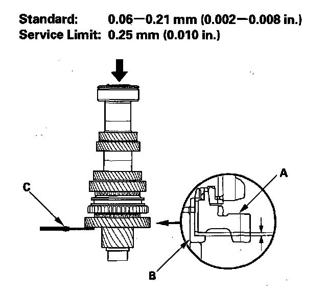 Countershaft Assembly Clearance Inspection1. Measure the clearance between 1st gear (A) and the distance collar (B) with a feeler gauge (C).