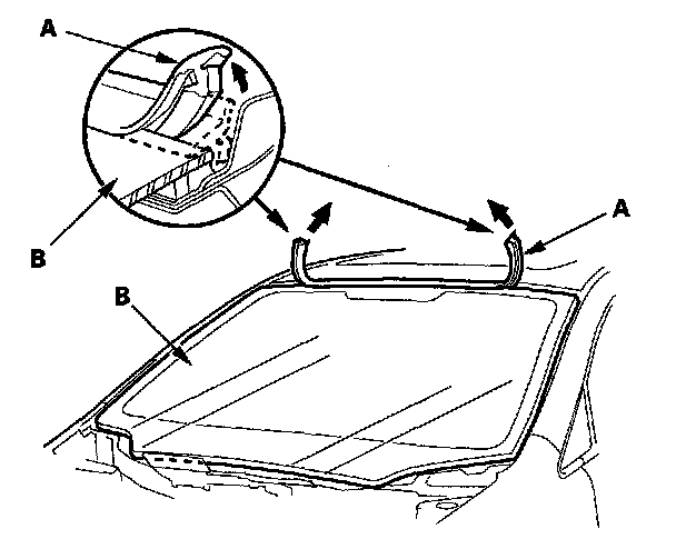 2. Remove the molding (A) from the upper edge of the windshield (B). If necessary, cut the molding with a utility knife.