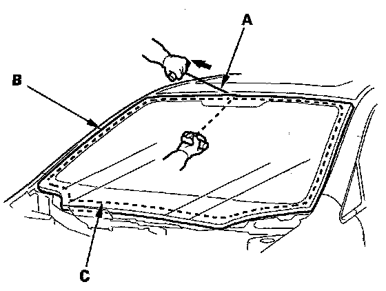 6. With a helper on the outside, pull the piano wire (A) back and forth in a sawing motion. Hold the piano wire as close to the windshield (B) as possible to prevent damage to the body and dashboard. Carefully cut through the rubber dam and adhesive (C) around the entire windshield.