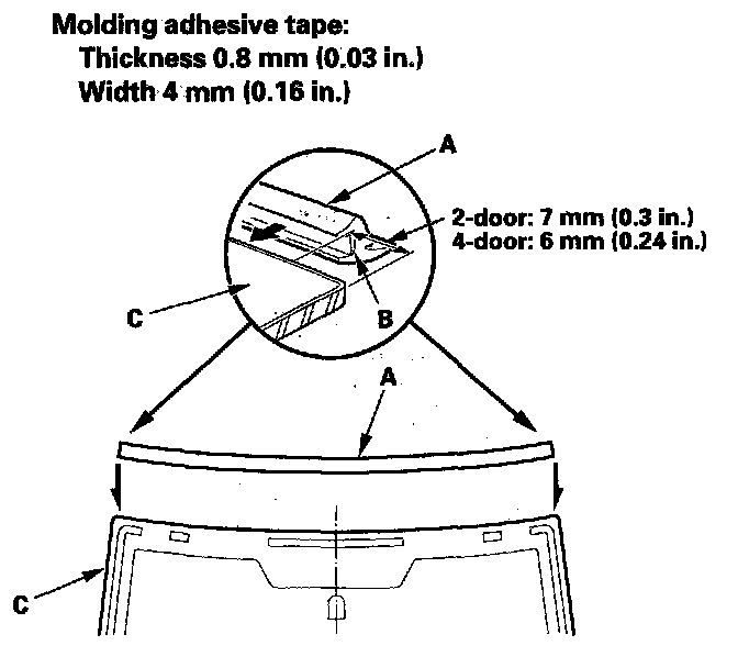 12. Attach the molding (A) with adhesive tape (B) to the upper edge of the windshield (C). Be careful not to touch the windshield where adhesive will be applied.