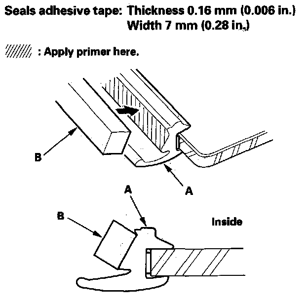 13. Apply primer to the molding (A), then attach the molding upper seal (B) with adhesive tape to the inside surface of the molding as shown.