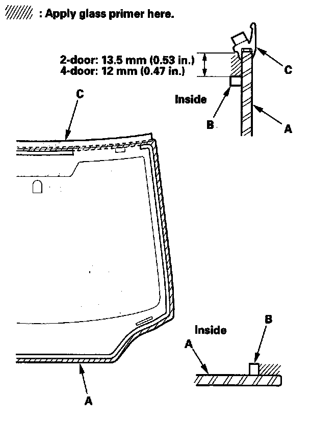 17. Apply a light coat of glass primer with a sponge around the edge of the windshield (A) between the dams (B) and molding (C) as shown, then lightly wipe it off with gauze or cheesecloth: