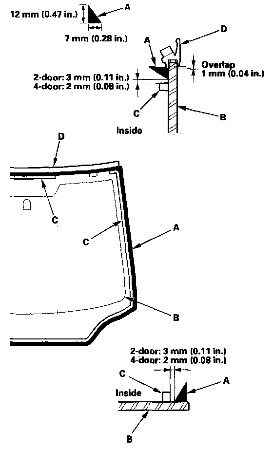 20. Pack adhesive into the cartridge without air pockets to ensure continuous delivery. Put the cartridge in a caulking gun, and run a bead of adhesive (A) around the edge of the windshield (B) between the dams (C) and molding (D) as shown. Apply the adhesive within 30 minutes after applying the glass primer. Make a slightly thicker bead at each corner.