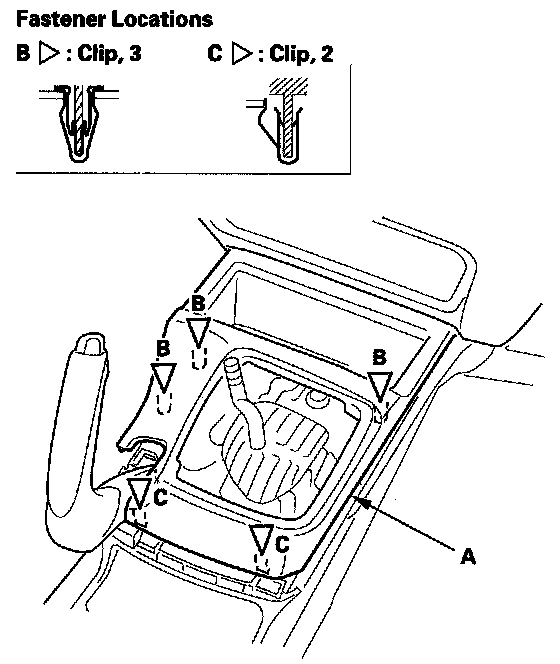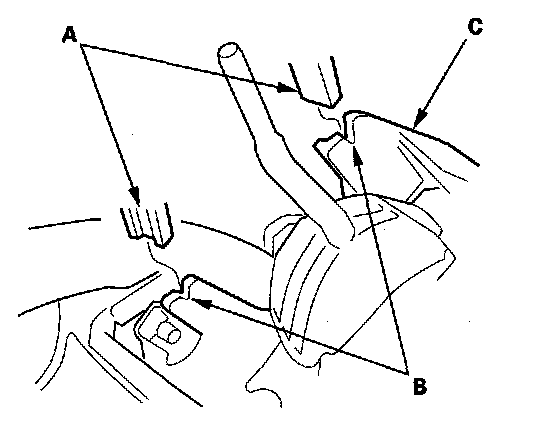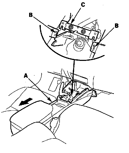 - When installing the center console panel, install the tabs (A) into the notch (B) of the parking brake base frame (C).